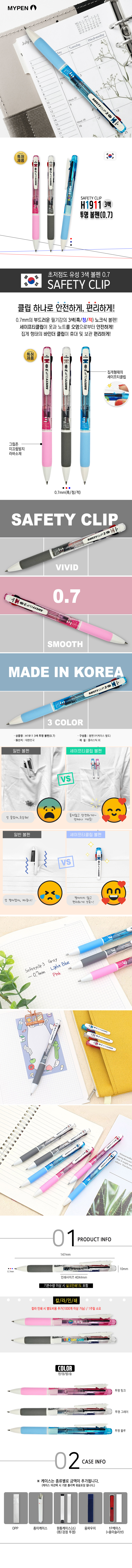 H1911 3색 투명볼펜(0.7mm SAFETY CLIP)